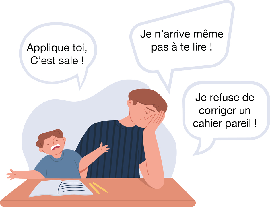 N'hésitez pas à demander un rendez-vous à l'enseignant de votre enfant et allez-y avec lui. Il est important que l'enfant entende que c'est un problème à ne pas prendre à la légère. Souvent les enseignants sont très attentifs à ne pas dévaloriser votre enfant. Ils compensent les problèmes en photocopiant les cours ou en adaptant le temps de copie. Si votre enfant n'a pas conscience du problème, il ne sera pas motivé pour consacrer un quart d'heure tous le jours pour le résoudre.